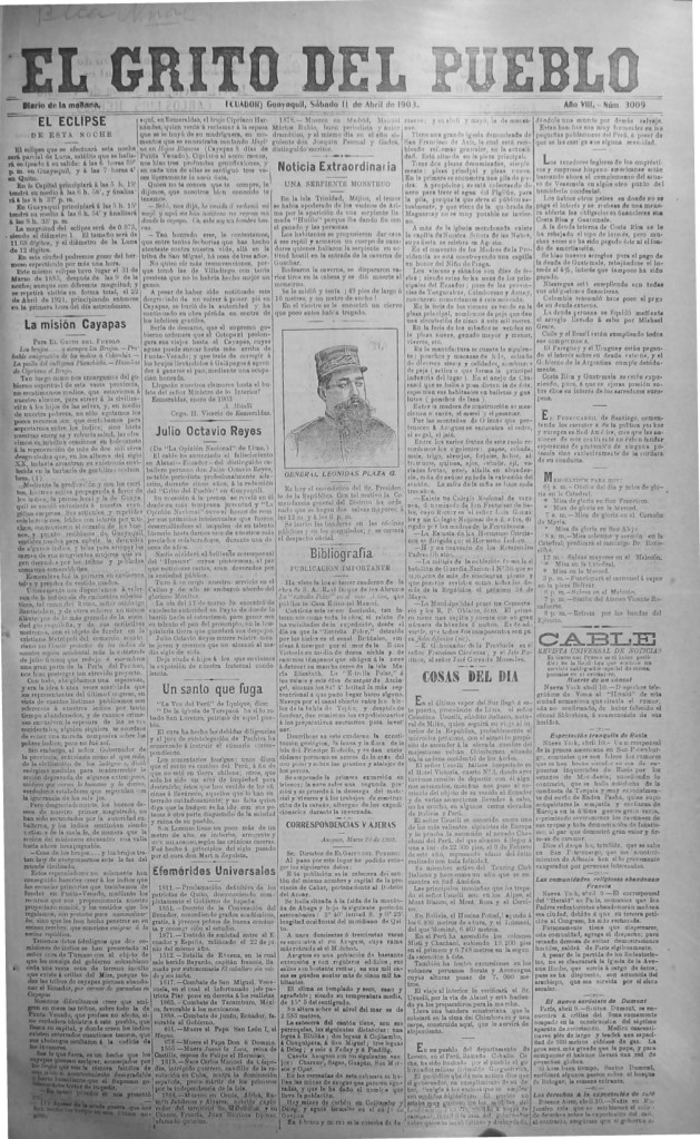 El Grito del Pueblo de 11 de abril 1903, en el cual sale la noticia que Celestino Usuelli visitó Guayaquil. Comparte esto: Haz clic para compartir en X (Se abre en una ventana nueva) X Haz clic para compartir en Facebook (Se abre en una ventana nueva) Facebook Me gusta Cargando...