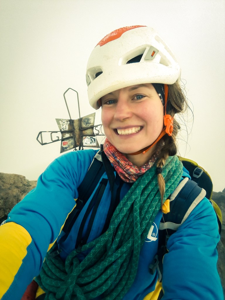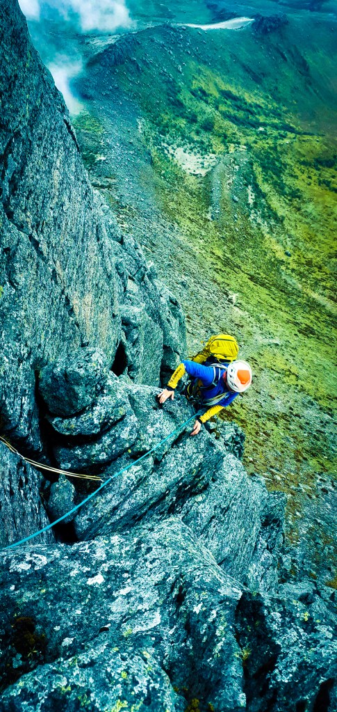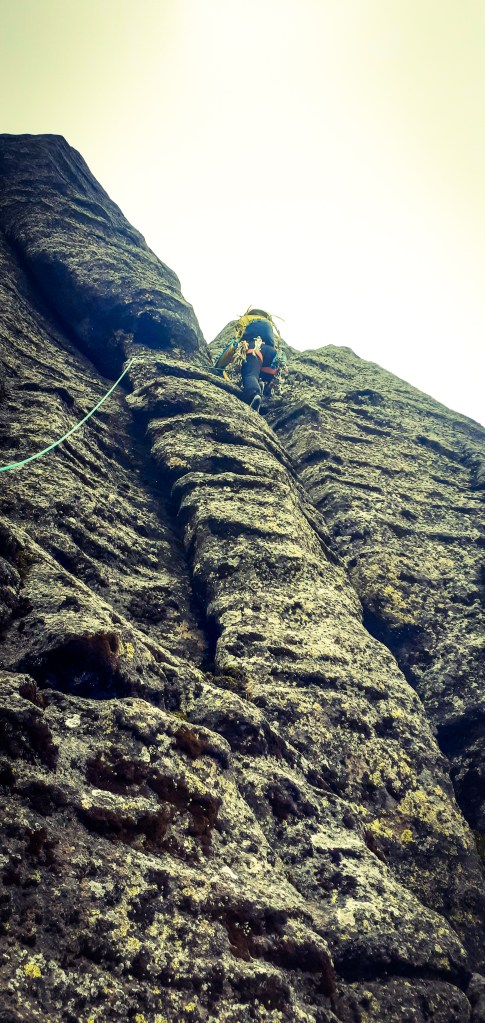 Grado Alpino: AD (terreno descompuesto, obligatorio de uso de la cuerda y protección, largos verticales, lugar remoto)
