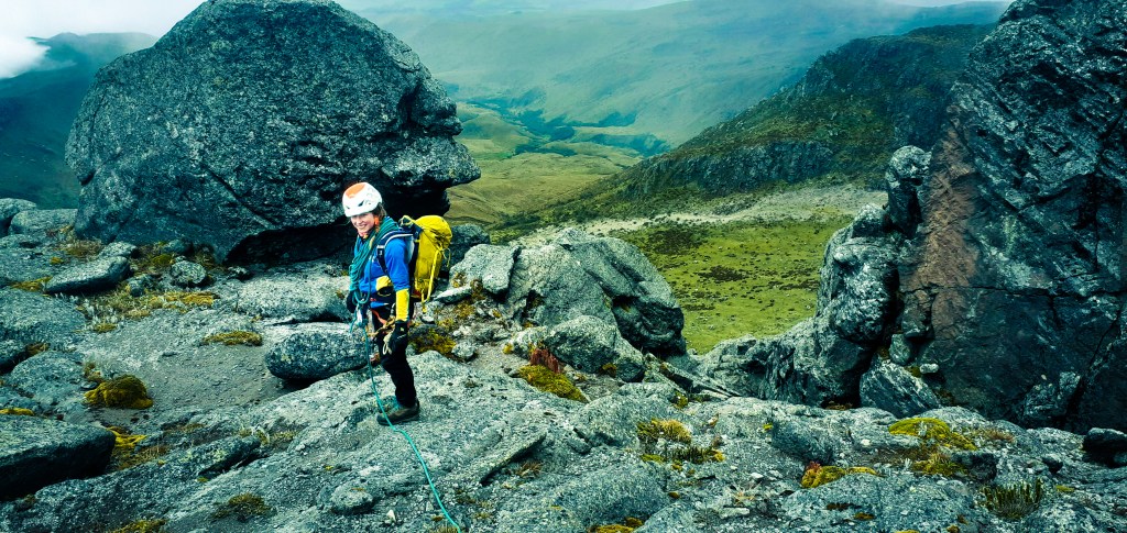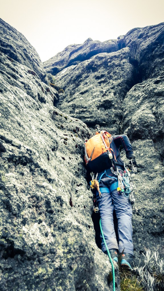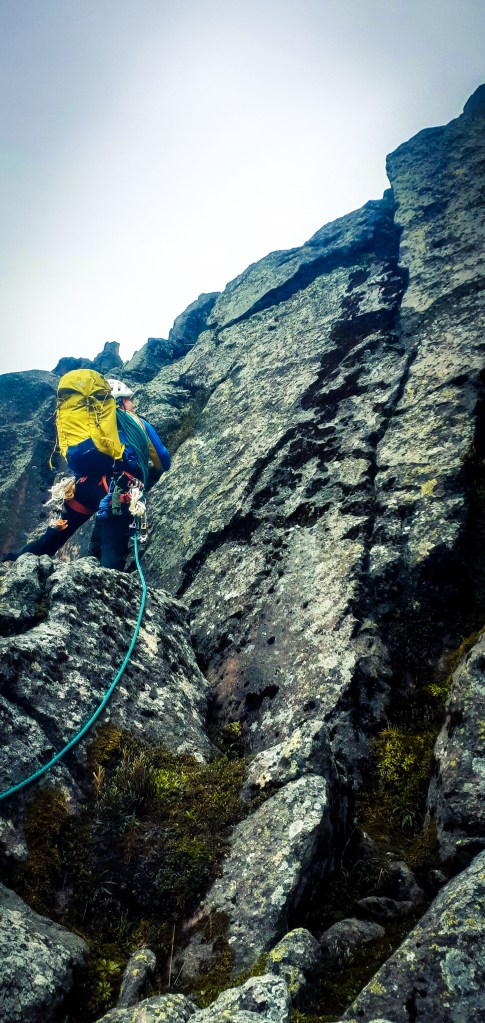 La arista se une con la arista de descenso de la cumbre del Iliniza Norte. Se puede continuar hacia cumbre sin uso de la cuerda.